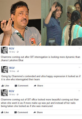 Ram Gopal Varma opined the happiness in Charmee’s Face while stepping out of Excise Office has gave an impression that she herself interrogated SIT not vice versa. He went on to say the Actress appeared more beautiful while coming out of Excise Office than when she went in. While he described Charmee as a modern-day ultra high Sony Alfa marvel & Jhansi Lakshmi Bhai, Akun Sabharwal was compared to cranked camera belonging to 1920s.